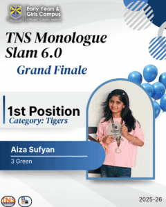 We are overjoyed to share that Aiza Sufyan (Grade 3 Green) has secured 1st Position at the TNS Monologue Slam 6.0 – Grand Finale 🏆✨