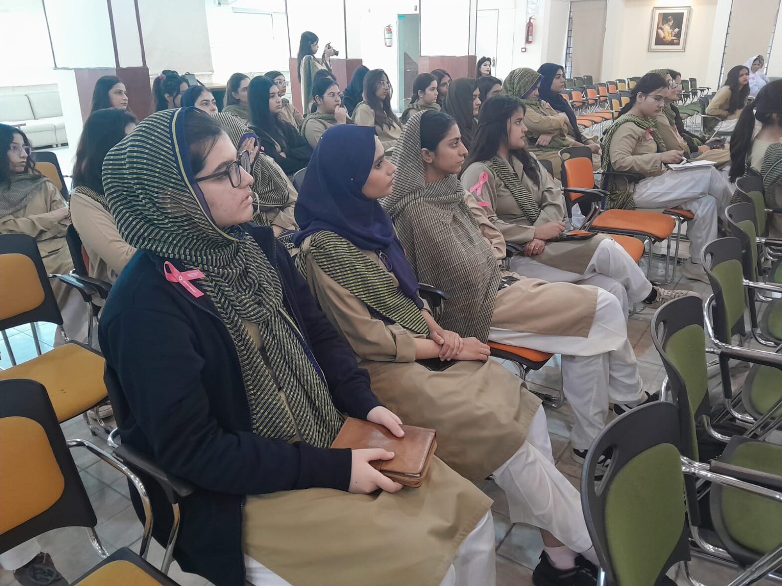 In honour of Pinktober, Shaukat Khanum Memorial Hospital organized an enlightening Breast Cancer Awareness Session for students. The session was led by Dr. Mahnoor, who delivered an informative presentation on the causes, prevention, and early detection of breast cancer. She emphasized the importance of regular self-examination and explained practical steps to perform it correctly.