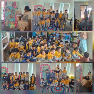 The library was transformed into the coziest reading corner, complete with soft cushions and warm lights. Students sat comfortably on the floor with cushions and plush toys, while Grandma radiated warmth and kindness. She brought a cherished book, “The Thirsty Crow,” a classic tale about wisdom, logical thinking, and creativity.