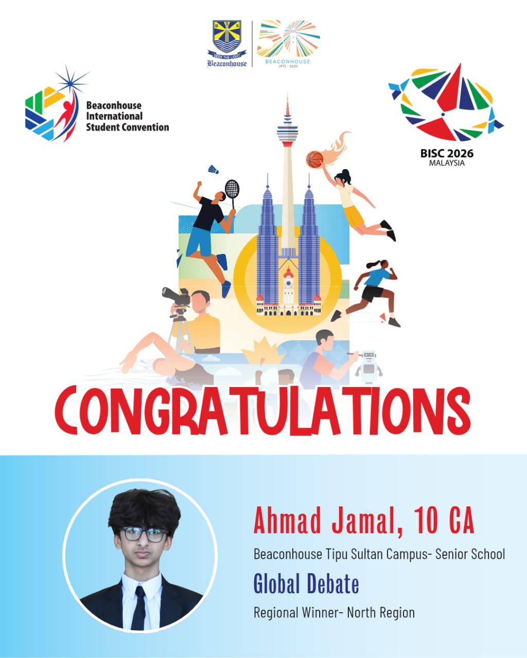 We are proud to announce that Ahmad Jamal, a student of Grade 10 CA at Beaconhouse Tipu Sultan Senior Campus,… Continue reading Regional Debate Champion!