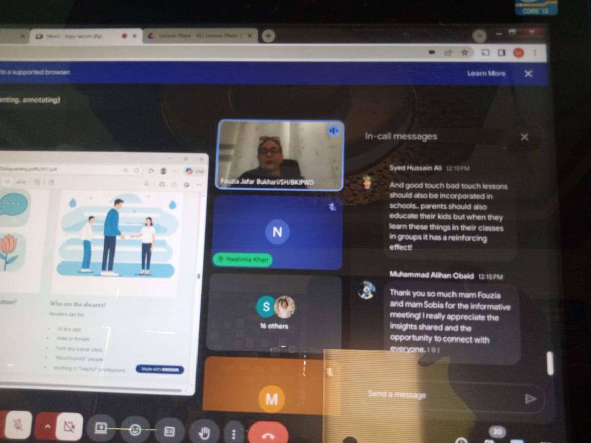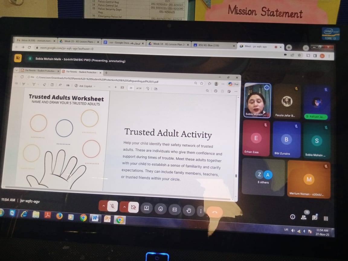 The school conducted an informative online session to raise parents’ awareness about the Student Protection and Safeguarding Policy. The session was hosted by our School Head, Ma’am Fauzia Janjua, along with Senior Mistress Ms. Sobia Mohsin, who guided parents through the key measures the school has implemented to ensure the safety and well-being of every child. Parents were encouraged to understand their vital role in safeguarding and to stay connected with the school in promoting a secure and supportive learning environment.