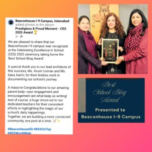 While this award highlights exceptional content creation, it also reflects the collective efforts of our teachers, students, leaders, and parents, whose enthusiasm and achievements bring the blog to life. Every activity, competition, classroom moment, and celebration documented reflects the strong culture of collaboration and excellence at Beaconhouse I-9 Campus.