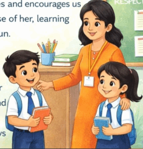 She also teaches us good manners. She tells us to respect our parents, teachers, and classmates. She says that we should always be honest and disciplined. I learn many good habits from her.