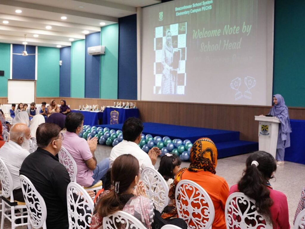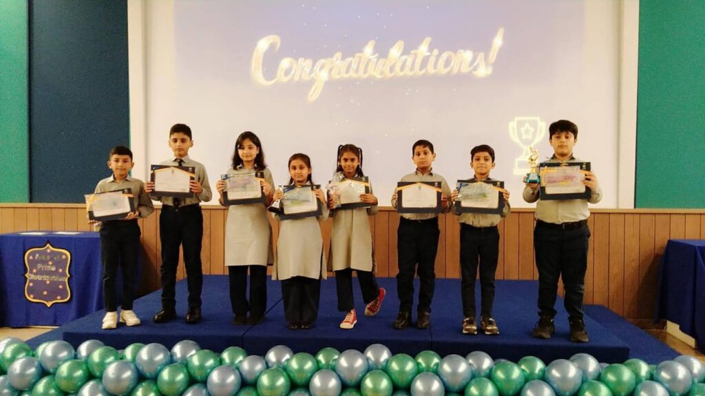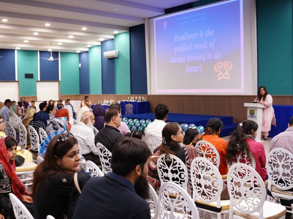 The ceremony began with the recitation of Surah Teen, creating a serene and spiritual atmosphere. This was followed by the National Anthem, sung with passion and pride, uniting everyone in a moment of patriotism. The program then continued with a warm and inspiring welcome address by the School Head, Ms. Sumera Savez. In her speech, she extended heartfelt thanks to parents for their constant support, acknowledged the efforts of teachers for their dedication, and congratulated the students for their remarkable accomplishments. She emphasized the importance of hard work, consistency, and a growth mindset as key drivers of success, motivating the students to continue striving for excellence in the future. After the address, the most awaited part of the ceremony began — the distribution of prizes. Students who had excelled in various categories were invited on stage to be recognized and celebrated. Awards were presented in multiple categories, including: Highest Marks in Core Subjects, Highest Attendance, Outstanding Achievement Awards and Excellence Awards.