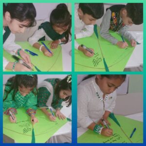 Students and teachers came together to celebrate unity and optimism through a symbolic activity – Kite of Hope. Beautiful kites carrying heartfelt messages of hope, peace, and prosperity for Pakistan were designed and displayed. Each kite represented the soaring dreams of our young generation and the collective prayers of our educators for a brighter tomorrow. As the kites took flight, so did the spirit of determination, resilience, and love for our homeland. Together, we marked this day with a promise to keep Pakistan’s future flying high with hope.