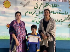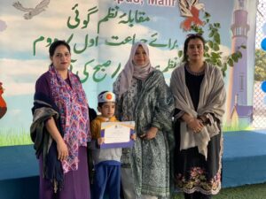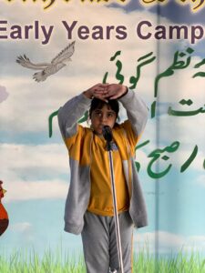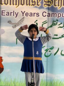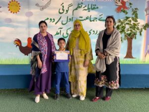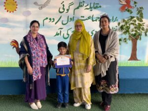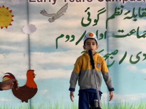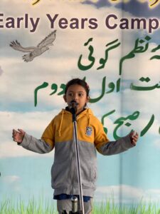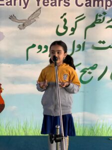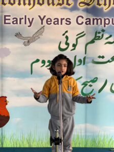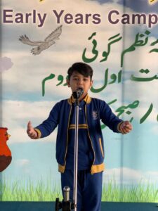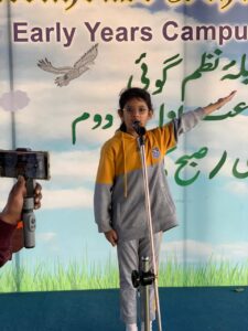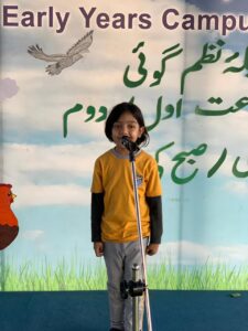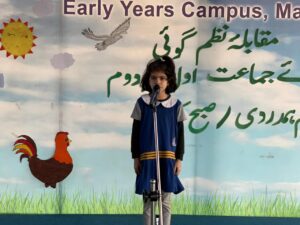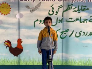 دوسری جانب جماعت دوم کے طلبہ نے نظم “صبح کی آمد” کو خوش الحانی، روانی اور دلکش انداز میں پیش کر کے محفل کو مسحور کر دیا۔ آواز کے اتار چڑھاؤ، الفاظ کی درست ادائیگی اور نظم کے جذباتی حسن نے ایک نئی صبح کی تازگی کو گویا لفظوں میں ڈھال دیا۔ بچوں کی پیشکش نے یہ ثابت کر دیا کہ کم عمری میں بھی فنِ اظہار کی بھرپور صلاحیت موجود ہوتی ہے۔