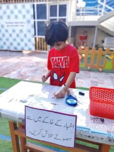 اسی کے ساتھ ساتھ جماعتِ اول کے طلبہ نےپرانی اشیاء سے نئی اور کارآمد چیزیں بنانے کا تجربہ بھی کیا۔ بچوں نے اپنی تخلیقی صلاحیتوں کا مظاہرہ کرتے ہوئے روزمرہ کی پرانی چیزوں کو خوبصورت اور نئی اشیاء میں بدل دیا۔ جب ان کی تیار کردہ اشیاء کی نمائش ہوئی تو ان کے چہروں پر خوشی اور فخر کی جھلک نمایاں تھی۔ یہ سرگرمی بچوں میں ماحولیاتی شعور، خود اعتمادی، اور تخلیقی سوچ کو فروغ دینے کا ذریعہ بنی۔