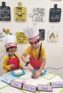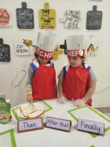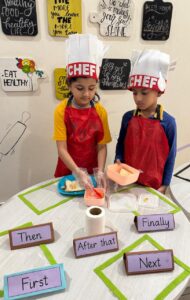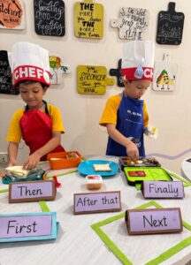Our students learned that to make anything correctly, they have to do things in the right order. They used special Time Sequence Words to help them. Can you spot them in the pictures?