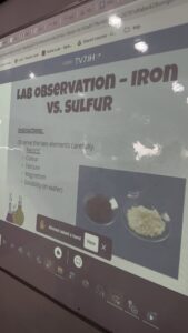 Next, they observed a heated iron–sulfur mixture forming a new compound—an eye-opening moment as they identified colour changes, loss of magnetism, and signs of a chemical reaction.
