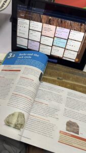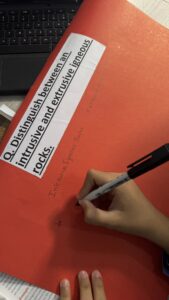 To deepen their knowledge, students examined pictorial illustrations and textbook references that explained igneous, sedimentary, and metamorphic rocks. Through guided discussions, they learned how heat, pressure, cooling, and compaction shape each type of rock over time. Learners then added key points to their digital portfolios, supporting both comprehension and long-term retention.