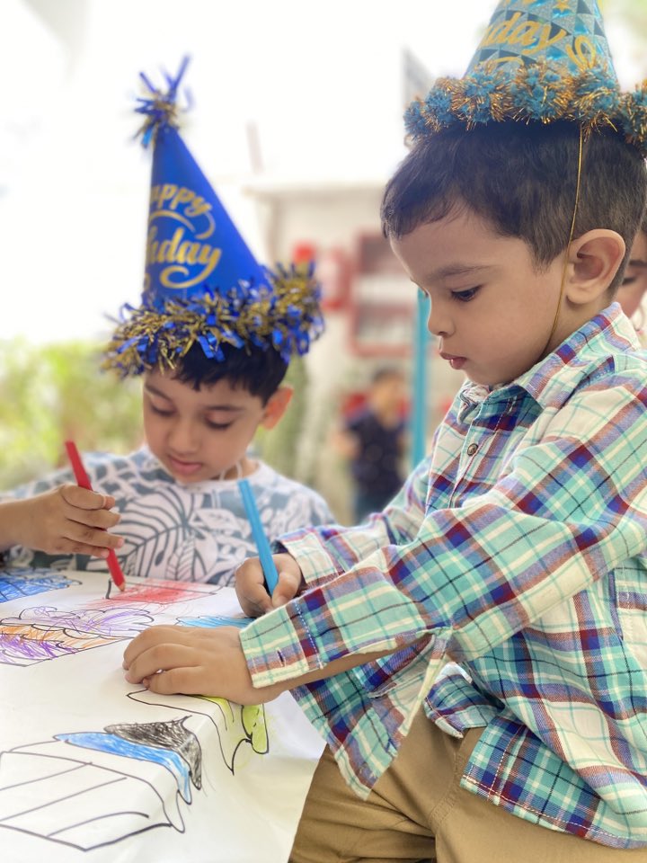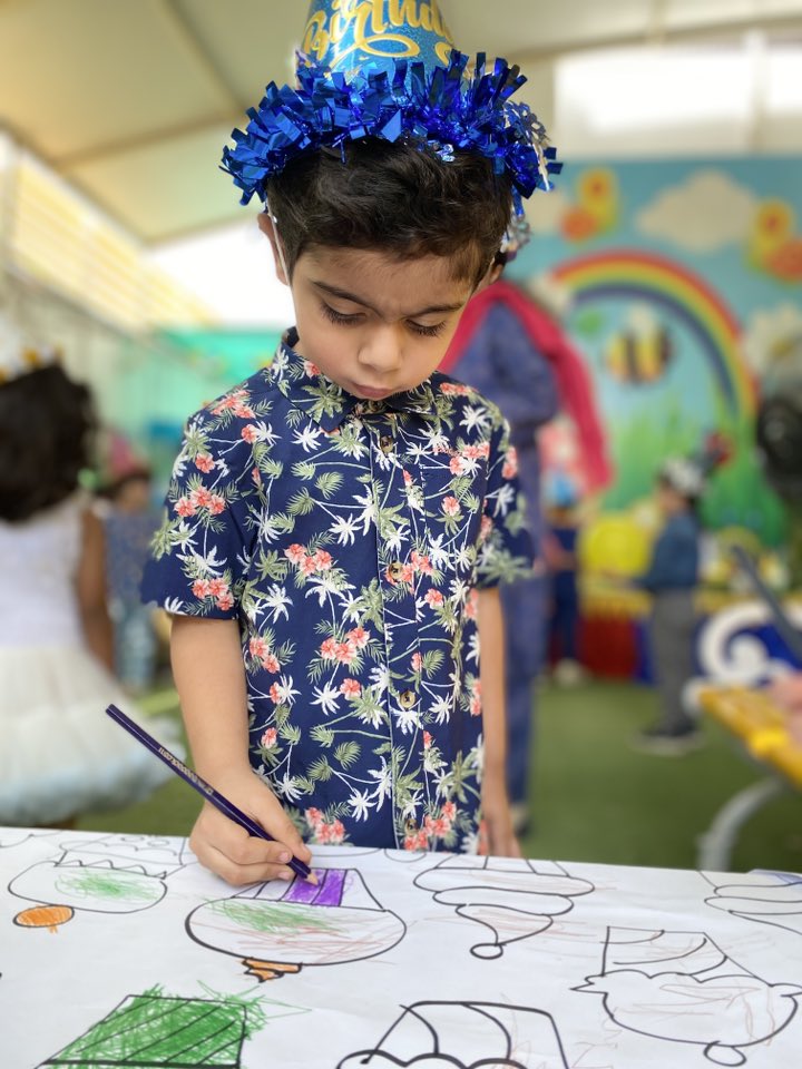 The celebration began with a creative doodling activity where the children colored and decorated the outline of a cupcake. They used crayons, stickers, and glitter to make their cupcakes look as sweet and sparkly as possible. Next, the children worked together to decorate a big dummy cake — adding paper candles, sprinkles, and ribbons to make it look festive and special for Goose.