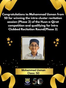 Mohammad Usman from LP1 has achieved 1st position in the Husn-e-Qirat Intra-Cluster Round (Phase 2). His remarkable recitation skills, clarity, and devotion have earned him a well-deserved place in Phase 3 — the Intra-Clubbed Recitation Round.