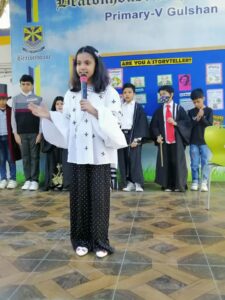 Students of class IV presented an informative assembly on well-known authors of children’s books. The books that they wrote were introduced. It was a part of their reader Story-Tellers. Their costumes were based on the famous characters of the novels like Charlie and the Chocolate factory by Roald Dahl and Harry Potter by J.K Rowling. Their dialogue delivery and confidence was outstanding. Audience enjoyed the assembly and answered the questions asked in the end. ‘