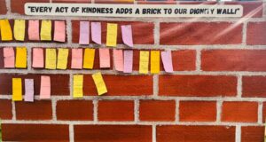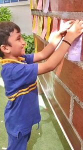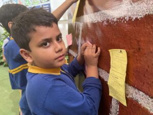 Inside the school, a Dignity Wall slowly came to life. Class 2 students wrote down acts of kindness and placed them on the wall. Helping a classmate. Sharing a snack. Using gentle words. Each act formed a piece of a colorful reminder that dignity grows when practiced every day.