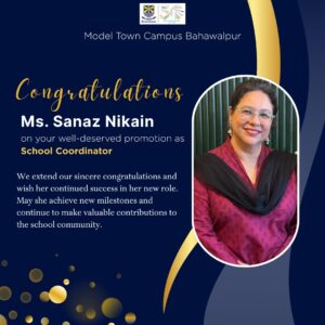 Model Town Campus proudly celebrates the well-deserved promotion of Ms. Sanaz Nikain to the esteemed position of School Coordinator. This achievement stands as a reflection of her unwavering dedication, professionalism, and consistent pursuit of excellence in the field of education.